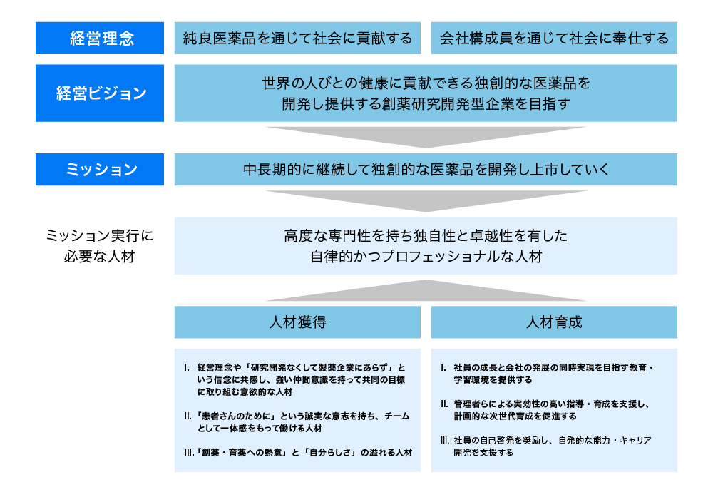 キッセイ薬品の経営理念にあるとおり、当社の存在意義は純良医薬品・会社構成員を通じた社会に対する貢献と奉仕にあります。新薬開発の高度化、開発リスクが高まる中で、中長期的に継続して独創的な医薬品を開発し上市するには、経営環境の変化に的確かつ迅速に対応し、より高度な専門性を持ち独自性と卓越性を有した自律的かつプロフェッショナルな人材を獲得、育成していく必要があります。このような考えのもと、当社では新卒採用およびキャリア採用を積極的に展開し、特に研究職については、基礎研究から非臨床研究までをカバーし、最先端技術と柔軟なアプローチで革新的な低分子医薬品の創製と多彩なモダリティの導入品開発に取り組むことができる人材の獲得に取り組んでいます。そして、人材育成については「自律型人材の育成」を人材育成のメインビジョンとして掲げ、経営戦略を実現する創造性のある人材の育成に取り組んでいます。